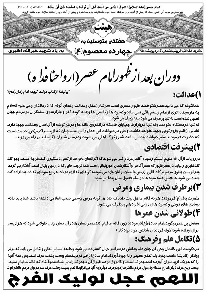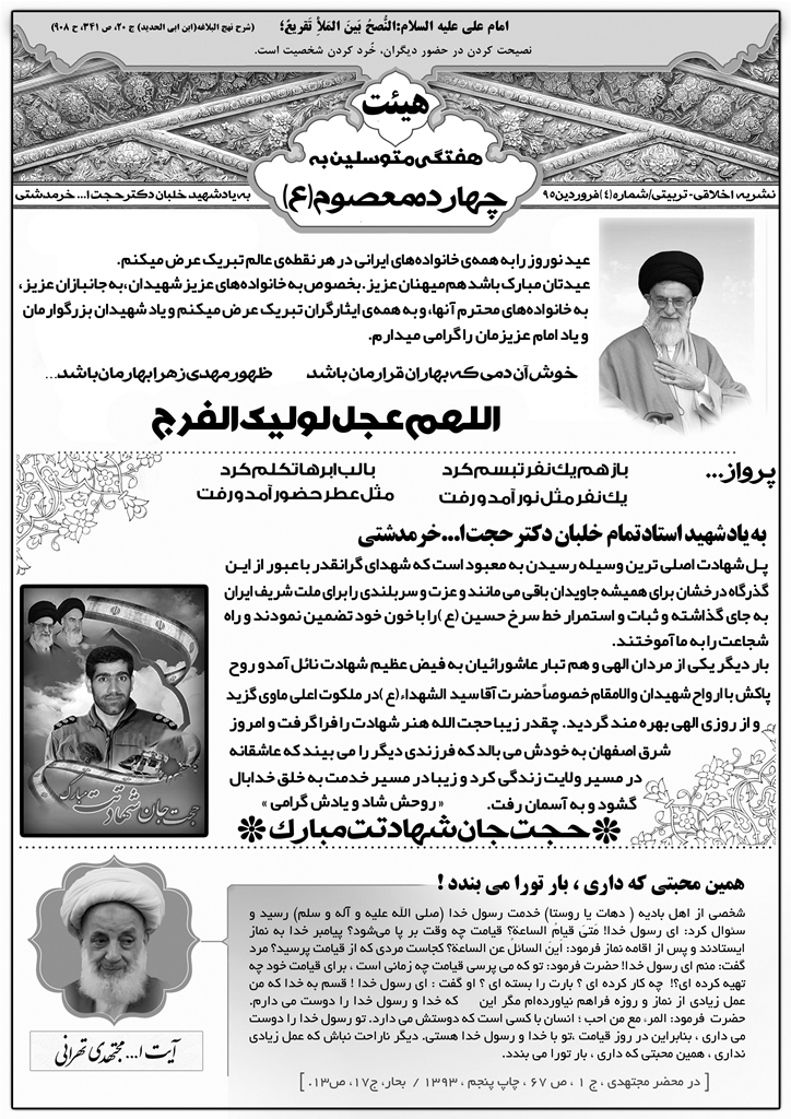 هیئت هفتگی متوسلین به چهارده معصوم (ع)هرهفته سه شنبه شب ها زیارت عاشوراودعای توسل درمنزل یکی ازخادمین