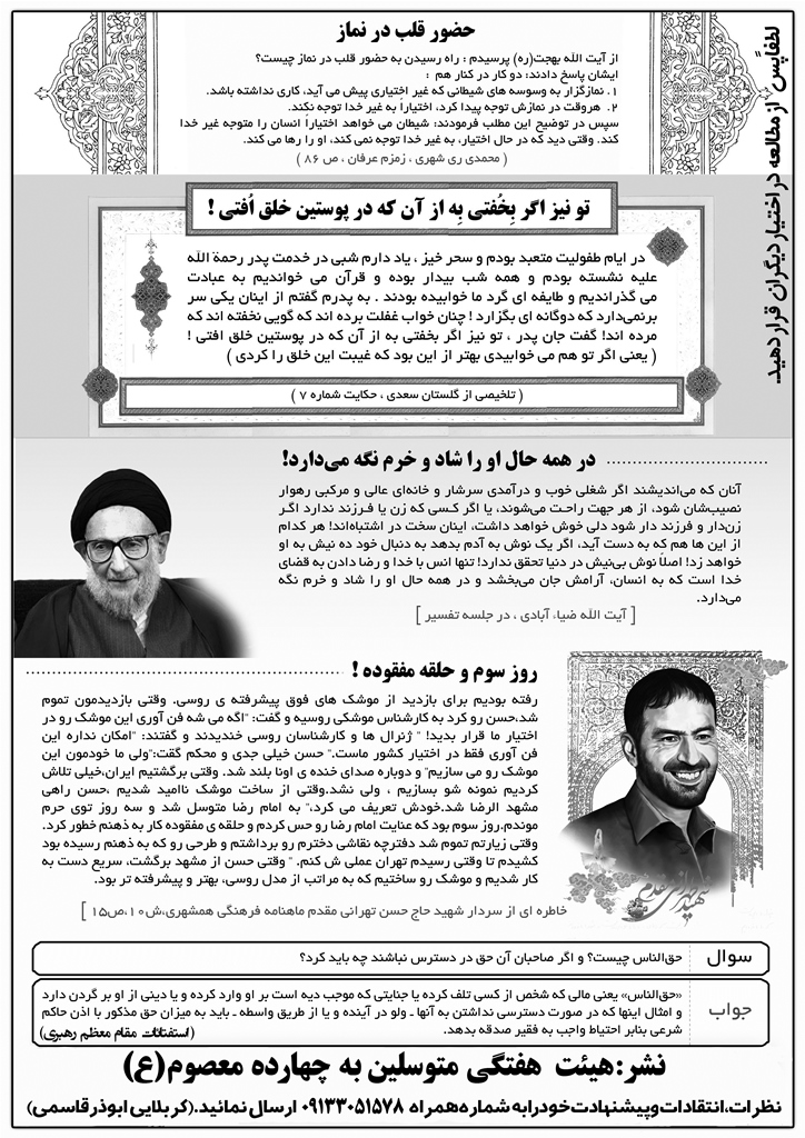 ضمن اینکه قراربراین شدکه سوالاتی ازوصیت نامه حضرت امام(ره)درقالب مسابقه طراحی شودتاجوانان عزیز بیشترباوصیت نامه حضرت امام(ره)آشنا شوند.